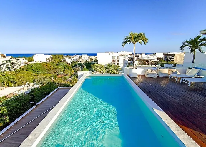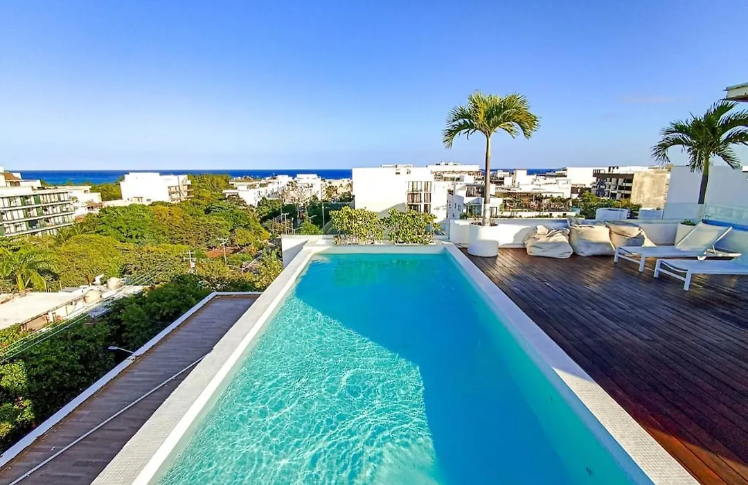 The 50 ft² Wide Studio With Sunny Balcony Pool Gym Steps 2 Beach Playa del Carmen lies in the Centro district of Playa del Carmen and offers swift access to Martina Beach Club, which is only 6 minutes' walk away. Offering a sunbathing terrace, the 1-bedroom apartment also features a rooftop swimming pool for guests ultimate relaxation.